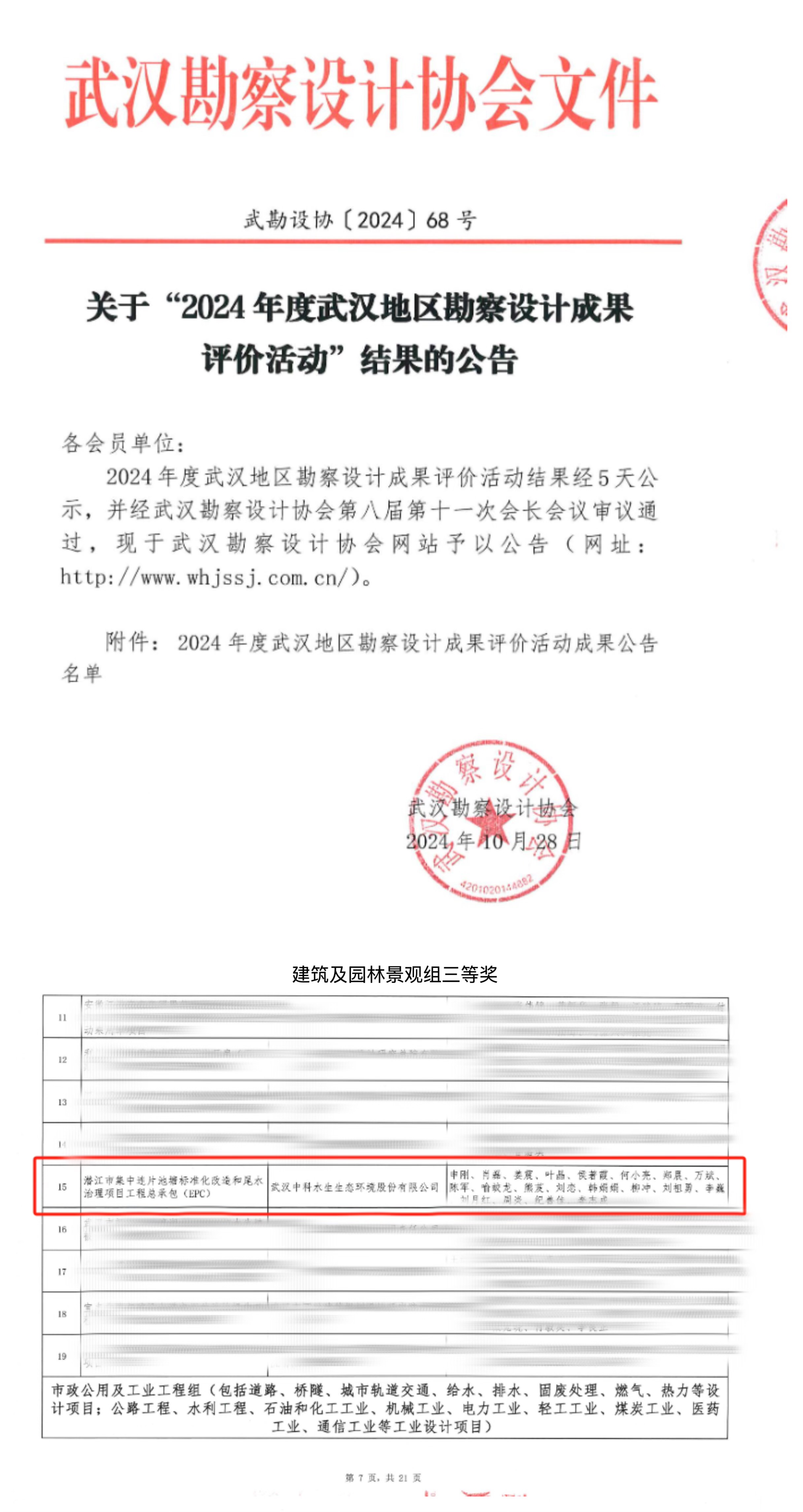 2024年,武漢中科水生公司蟬聯(lián)獲評(píng)武漢勘察設(shè)計(jì)協(xié)會(huì)“2023-2024年度優(yōu)秀會(huì)員單位”,由公司設(shè)計(jì)的“潛江市集中連片池塘標(biāo)準(zhǔn)化改造和尾水治理項(xiàng)目工程總承包(EPC)”榮獲武漢勘察設(shè)計(jì)協(xié)會(huì)建筑及園林景觀組設(shè)計(jì)獎(jiǎng)項(xiàng)三等獎(jiǎng)。多個(gè)獎(jiǎng)項(xiàng)的獲得是武漢勘察設(shè)計(jì)協(xié)會(huì)對(duì)中科水生持續(xù)多年改革創(chuàng)新和綜合設(shè)計(jì)能力的充分肯定。