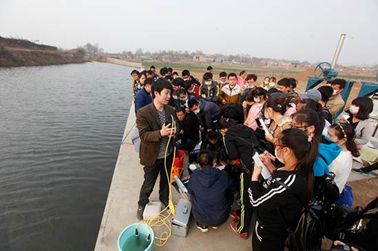 工作人員向?qū)W生們講解如何檢測(cè)水體。(焦宇 攝)