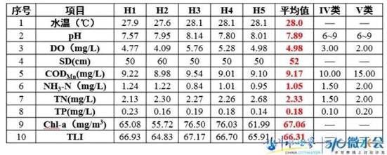 濱湖水體為地表水劣V類,其主要超標污染物為總氮和總磷,由綜合營養(yǎng)狀況指數(shù)(TLI)可看出,水體處于中度富營養(yǎng)狀態(tài)。
